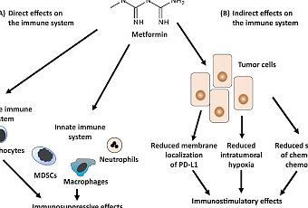 La metformine est utilisée pour le traitement du diabète mellitus de type 2 et a montré des effets thérapeutiques dans des modèles précliniques d’autres pathologies comme le cancer et les maladies autoimmunes. L’activité antitumorale de la metformine est due, en partie, à des effets immunostimulateurs. Dans d’autres contextes pathologiques, comme des maladies autoimmunes et inflammatoires, la metformine montre des effets immunosuppresseurs. Il existe des évidences indiquant le caractère indirect des effets immunostimulateurs de la metformine. Les effets immunosuppresseurs de la metformine dans d’autres pathologies semblent être la conséquence directe de son action sur les cellules immunitaires. Sur la base de ces observations, nous sommes d’avis que la pharmacologie de la metformine est dépendante du contexte pathologique qui, à notre connaissance, est un concept nouveau en pharmacologie. Fabrizio Marcucci, et al, dans Trends in Pharmacological Sciences, publication en ligne en avant-première, 5 février 2020Source iconographique, légendaire et rédactionnelle : Science Direct / Traduction et adaptation : NZ