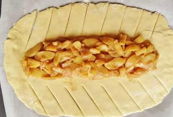 Ensuite placez vos pommes au centre et coupez la pâte entourant la garniture en bandes diagonales d'environ 2 cm de large.