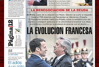 A Paris, Alberto Fernández a effectué hier sa première visite officielle et Emmanuel Macron lui a promis de lui apporter l’aide de la France dans le règlement des dettes de l’Argentine envers le FMI… Emmanuel Macron faisait tout autant bonne figure à Mauricio Macri, celui-là même qui a endetté le pays à une hauteur inimaginable… La une de Página/12 s’en donne à cœur-joie, ce qui est assez courant dans ce quotidien.