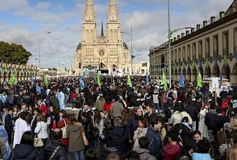 Un rassemblement sur Plaza Belgrano, devant la basilique de Luján