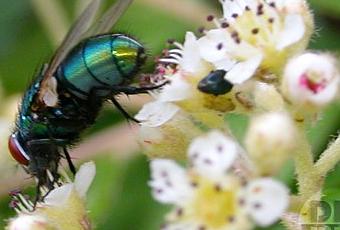 Il me semble avoir déja rencontré cette mouche verte sur un wégélia. Ce serait donc une Mouche Verte (Lucilia caesar). Elle fait partie de la famille des Calliphorides. Or elle ressemble beaucoup à deux autres espèces de la famille des mouches domestiques, et un peu à une espèce de la famille des Tachinaires. Et sous cet angle, difficile de faire la différence ...