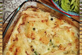 - Peler les pommes de terre cuites puis les couper en gros morceaux. Les ajouter dans la poêle avec les petits pois, saler et poivrer puis mélanger et verser le tout dans un plat à gratin. Arroser de crème liquide, mélanger.