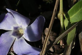 Vinca minor (Pervenche mineure) : herbacée vivace à tiges stériles rampantes devenant plus ou moins ligneuses ; feuilles ovales entières, vert foncé, persistantes ; fleurs isolées à 5 pétales bleus, parfois blancs, portées par des tiges dressées ; fructification très rare en Lorraine, se reproduit par marcottage de ses tiges rampantes. Forme des tapis en forêt ombragée sur sols à humus doux.