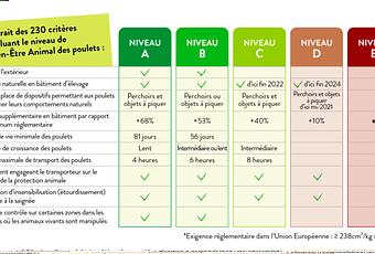 La synthétisation de ces 230 critères, se retrouvent sur une étiquette de niveaux, notés de A à E qui " couvrent les différentes étapes de la vie de l'animal, depuis la naissance, jusqu'à l'abattage en passant par le transport ". La mise en place de cette étiquette s'inscrit " dans une volonté commune d'accompagner le progrès de la filière tout en informant le consommateur de manière claire, fiable et robuste ".