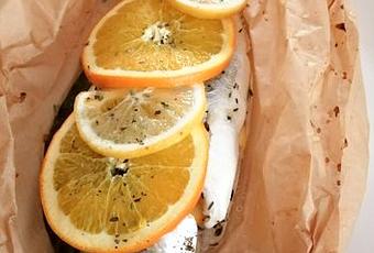 De la dorade cuite en papillote avec du citron, de l'orange et des herbes.