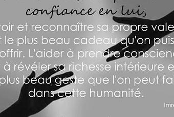 Aider l'autre à prendre confiance en lui, à voir et reconnaître sa propre valeur, est le plus beau cadeau qu'on puisse lui offrir. L'aider à prendre conscience et à révéler sa richesse intérieure et le plus beau geste que l'on peut faire dans cette humanité. - Imré Simon