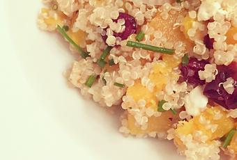 Dans un grand saladier, mélanger le quinoa, le butternut, et la feta coupée en petits morceaux.