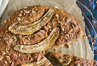 Coupez les 2 bananes restantes en deux, puis disposez-les au dessus du gateau.