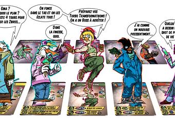 Révélez le Boss de l’Épisode en cours et glissez 1 ou plusieurs cartes Burger derrière sa carte de sorte à faire apparaître autant de Burgers que ses points de Vie. Fonzombie (Cf. photo ci-dessous) possède 5 points de Vie. Tous les membres de l’équipe peuvent affronter le Boss. Après avoir effectué votre Plan d’Attaque vous révélerez, tout comme avec un Zbire, une carte Action que vous placerez devant le Boss. Si c’est une carte T de sa classe, cela déclenche automatiquement sa Super Attaque Turbo. Pour Fonzombie sa super attaque ferait perdre 1 point de Vie à tous les Héros, Caramba !