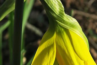 Narcissus pseudonarcissus (Jonquille) : herbacée à bulbes ; tige aplatie à 2 angles ; 2-5 feuilles allongées linéaires et dressées ; fleur solitaire penchée, à 6 tépales jaune, soudés en tube par leur partie inférieure puis étalés en étoile, tube prolongé par une couronne en entonnoir (paracorolle) plissée, crénelée et plus ou moins évasée en cloche ; spathe membraneuse engainante ; capsule ovoïde, graines noires brillantes. Forêts à humus doux, prairies, hautes chaumes