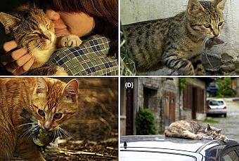(A) Les plupart des chats sous protection d’un propriétaire sont, dans les sociétés post-industrielles, principalement des animaux de compagnie. (B) Quelques chats, particulièrement dans les zones rurales, conservent leur rôle de gestionnaires des nuisibles résidants. (C) Dans certaines régions, les chats sauvages sont, dans les zones naturelles, soumis au contrôle en qualité d’espèce invasive non native, du fait de leurs effets délétères sur la faune indigène. (D) Globalement, les chats errants ou menant une vie moitié sauvage – moitié domestique, vivent dans et autour de colonies humaines, formant souvent eux-mêmes des colonies animales urbaines.