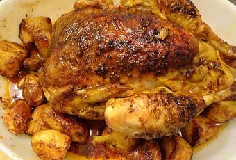 Découper le poulet puis servir avec les pommes de terre.
