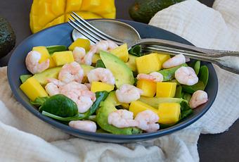 On commence la semaine et le mois avec une jolie petite salade fraicheur sucrée salée. Des produits de saison : de la mâche, de l'avocat, de la mangue et des crevettes pour une salade complète saine et délicieuse.