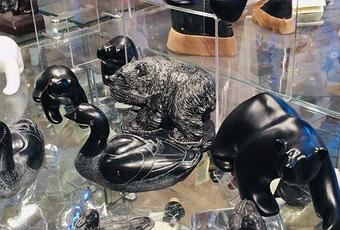 Pourquoi la pierre est-elle aussi lisse? J’apprends qu’à cause de la rareté du bois dans le nord du pays, les Inuits ce sont rabattus sur la pierre comme matériel pour leur art. À ce qu’il paraît, la stéatite, ou pierre à savon, est principalement très commune dans le nord du Canada. La stéatite présente des caractéristiques particulières, puisqu’elle est à la fois résistante et molle, donc relativement facile à travailler à l’aide d’outils simples. La serpentine et la péridotite sont également utilisées pour l’art inuit, quoique plus rares.