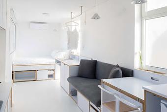 Pour donner une impression d’espace plus importante, l’intérieur mise sur la couleur blanche, une manière de renforcer la luminosité. L’ensemble du mobilier est ici regroupé dans un module qui longe l’ensemble des murs, faisant office de meuble tv, de sommier, de canapé, de table et de cuisine. La table à manger est montée sur pivot ce qui lui permet de se déployer si besoin, et deux chaise sont dissimulées dans le module pour occuper le moins de place possible lorsqu’elles sont inutilisées. L’installation des luminaires est elle aussi intéressante puisqu’elle suit le module pour orienter le flux lumineux là où il sera le plus utile.