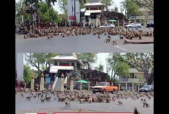 Lop Buri abrite des milliers de singes. Chacun doit prêter allégeance à l'un des deux gangs:les singes du temple et les singes de la ville. Normalement, les deux camps n'empiètent pas sur leurs territoires respectifs Cet accord vient d'être rompu et a donné lieu a une gigantesque bataillequi a choqué les humains locaux