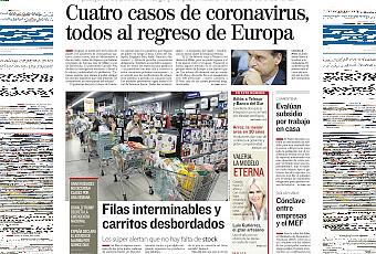 La photo centrale montre la ruée des consommateurs dans les supermarchés.