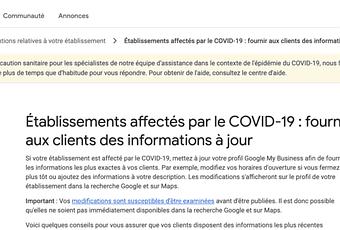 Est-ce que votre commerce ou entreprise est affecté par le COVID-19 ? Si c'est le cas, Google vous suggère avec raison, de mettre à jour les informations présentes sur votre fiche Google Mon Entreprise.