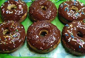 4. Bake in preheated 350°F (180°C) oven for 20 to 25 minutes. Place pan on wire rack and let cool for 5 minutes. Remove the donuts from pan and let them cool completely on the rack. Dip the top of each donut in the melted chocolate and decorate with the sprinkles.