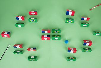 4. Un enfant se place à chaque extrémité de la table, face au but de l’équipe adverse, avec chacun une paille à la bouche. Le but du jeu est de souffler dans la paille, de faire passer le ballon entre les jambes des petits joueurs et de marquer un but.