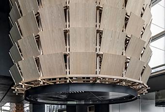 Cette intervention résonne que comme une ode à l’artisanat traditionnel japonais. Une ambiance calme et sereine se dégage de ce restaurant, mêlant grands volumes ouverts à des espaces plus intimes avec des plafonds bas. Globalement, le studio Esrawe a utilisé une palette cohérente de couleurs et de matériaux monochromes qui permettent de souligner le grand volume de l’espace. L’ensemble est sublimé par deux éléments en bois suspendus, qui renforcent l’impression d’espace lié à la hauteur sous plafond du lieu. Fabriqués en chêne, ces petits panneaux sont disposés de manière à se superposer pour créer une texture continue qui évoque l’image de l’armure des samouraïs, et en particulier le plastron, qui est connu en japonais sous le nom de « dō ». Non seulement décoratives, ces deux structures permettent de dissimuler les hottes d’extraction des cuisines. La décoration permet ici de joindre l’utile et l’agréable !