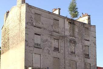 En juin 2008, le bâtiment est encore habité, aucune fenêtre n’est murée. Certes l’immeuble est décrépit ; le crépi de la façade s’écaille, les volets extérieur en métal sont rouillés et semblent se déchausser. Au rez-de chaussée, deux enseignes, à gauche sur fond jaune, Speed Rabbit Pizza conjugue vitesse lapin et... pizza. À droite, un salon de coiffure mixte, coiffure de mode Karim. L’établissement parait définitivement fermé. Le yellow rabbit, lui, est encore vivace. Notre regard remonte doucement du rez-de-chaussée au quatrième et dernier étage. Et que voit-on là haut, tout là haut, sur la photo ? Le soleil est au zénith. L’image est inondée de lumière et rend la vision incertaine. En anglais, on parle de « lense flare » pour décrire ces halos de lumière qui font irruption et aveuglent notre regard, ou plutôt celui de l’objectif de la caméra. En clignant des yeux, on croit voir accroché sur le toit, une sorte de buisson étincelant, enraciné et irradiant de lumière. Oui ! On distingue bien une touffe végétale au sommet du bâtiment. Sans doute l’arbrisseau est-il né d’une graine, peut-être apportée par le vent ou un oiseau, du Square Stalingrad ou du Parc Diderot, deux espaces verts situés non loin de là.