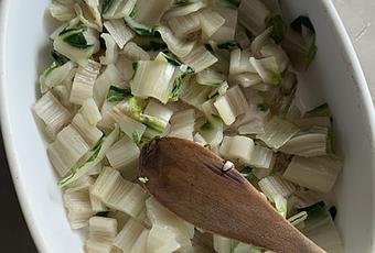 Commencer par séparer le blanc du vert des blettes. Couper le blanc en grosses lamelles. Couper le vert en grossièrement.