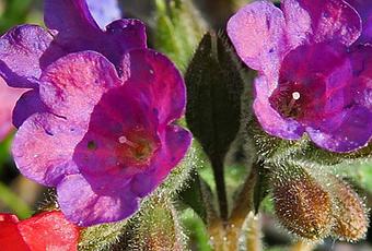 Pulmonaria montana (Pulmonaire des montagnes) : plante pourvue de poils étalés et poils glanduleux : tige arrondie, feuilles caulinaires à base cordée, feuilles basilaires d'été ovales elliptiques, à limbe progressivement rétréci en pétiole, feuilles non maculées ; fleurs rouges devenant bleues en têtes denses. Forêts fraîches, forêts de ravins, prairies