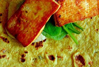 Dans les mêmes pains plats à la farine de pois chiches (rotis) dont je parlais avec mes hamburgers bhaji et que j'adore... Des wraps au tofu.