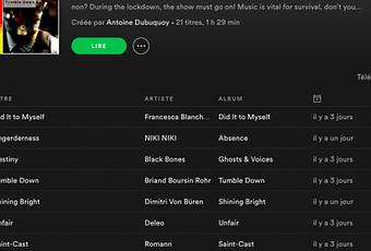 Le temps, entre deux sessions de télétravail d'écouter de la musique, de découvrir de nouveaux sons. J'ai donc compilé cette playlist à partir de découvertes. Quelques noms connus, quels retours vers le futur, de l'electro, de l'ambiant, de l'abrasif, du gros rock à guitares, du punk, de la pop. Un peu de Hinds, un peu de Jehnny Beth, un peu de Black Bones, un peu de Magenta. La pop de Dimitri Von Büren. Les classieux Niki Niki, juste parce que j'aime bien un morceau sorti il y a deux ans. Des petits nouveaux, comme Deleo, bientôt en interview express ici-même. Et des sons apaisants, comme Romann, Alain Dorra ou Glass Museum. Le son abrasif de Dantec. Des guitares et du gros son, avec Lonely Old Boy, ToyBloïd ou les punks anglais de Smiling Assassin. Et pour conclure, l'electro swing de Lyre Le Temps. Bref, une vingtaine de titres, un peu en vrac (comme moi au bout d'un mois de confinement).