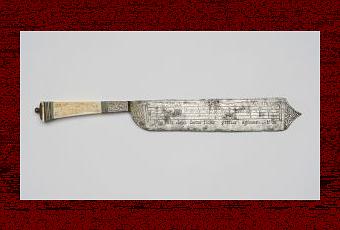 Répertoriés dans 3 musées et une collection privée (Jacques Hollander), ces rares spécimens de couteaux datent approximativement de 1550 et ont la particularité d’avoir les deux côtés de leurs lames gravées d’une partition.