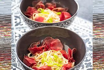 J’ai tranché finement un peu de viande séchée pour faire penser aux fines tranches de bœuf qui cuisent dans le bouillon (pas de viande dans le frigo pour moi), mais cela va aussi sans, ou avec du bœuf.