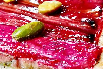 - Monter la tarte, foncer le moule, étaler la crème de pistaches, mettre la rhubarbe et au four 180C pendant 30 minutes, la pâte doit être dorée.