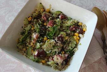 -125 g de quinoa -1/2 concombre -1 petite boite de maïs -300 g de salade de poulpe à l'huile -1 oignon nouveau -10 feuilles de menthe -le jus d'un citron vert -1 cs d'algues dulse en paillettes -sel, poivre de SichuanCuire le quinoa comme indiqué sur le paquet. Égoutter et laisser refroidir