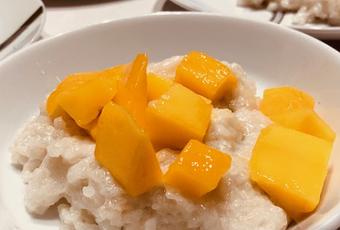 D’après le recette du site Toute la Thaïlande, riz gluant à la mangue et au lait de coco : Khao Niao Ma Mouang