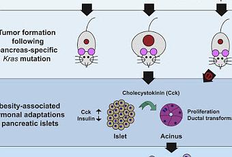 L’obésité est un facteur de risque majeur modifiable de l’adénocarcinome canalaire du pancréas (ACP) ; toutefois, on ne sait ni comment ni quand l’obésité contribue à l’ACP. Grâce à l’utilisation d’un modèle de souris autochtone, nous démontrons un lien causal et réversible entre obésité et ACP précoce en progression, montrant que l’obésité amplifie fortement la tumorigénèse, alors qu’une perte de poids induite génétiquement ou par un régime alimentaire spécifique freine le développement du cancer. Des analyses moléculaires d’échantillons humains et murins définissent les conséquences micro-environnementales de l’obésité qui favorisent la tumorigénèse plutôt que d’indiquer de nouveaux agents mutagènes, y compris les significatives adaptations cellulaires des îlots pancréatiques en présence de tumeurs associées à l’obésité. Plus précisément, nous identifions ici l’expression aberrante de l’hormone peptidique cholécystokinine (CCK) en réponse à l’obésité et montrons que la CCK des îlots stimule la tumorigénèse des canaux pancréatiques alimentée par l’oncogène Kras. Nos études fournissent des arguments en faveur du fait que la progression de l’ACP est alimentée par les changements localisés dans le microenvironnement tumoral, associés à l’obésité, sous influence de la signalisation endocrine-exocrine au-delà de celle de l’insuline, dans le développement de l’ATC. Katherine Minjee Chung, et al, dans Cell, publication en ligne en avant-première, 17 avril 2020