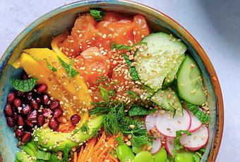 Dans ma vie d'avant , non confinée , je mangeais assez régulièrement des poke bowl parce que j'avais la chance d'avoir 3 petites cantines à côté de l'appartement qui en proposaient des délicieux . Mais tout çà c'était avant .... donc nous nous sommes mis à en faire ce n'est pas compliqué et pas vraiment une recette mais plutôt une idée de repas .Les poke viennent de la cuisine hawaïenne , ils se composent de poissons crus coupés en cubes , d'une base de riz ou de quinoa et d'un mix de légumes crus et/ou cuits , de fruits frais et de graines .Donc autant vous dire que vous avez une multitude de variations de poke et je suis certaine que vous allez être super créatifs et vous faire un très beau et bon poke .