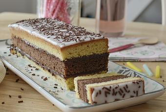 Vous obtenez 3 tranches de gâteaux. Déposez une tranche de vanille sur un plat, ajoutez de la ganache, la tranche au chocolat, de la ganache à nouveau puis la dernière tranche à la vanille.