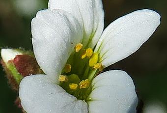Saxifraga granulata (Saxifrage granulée) : herbacée garnie de poils visqueux ; tige dressée ramifiée dans sa partie supérieure ; feuilles basales en rosette, pétiolées, arrondies et cordées, crénelées ; inflorescence en corymbe lâche, fleurs à 5 pétales blancs non tachés. Prairies calcaires et alluviales, talus