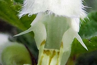 Lamium album (Lamier blanc, Ortie blanche) : herbacée vivace pubescente ; feuilles opposées ovales-aiguës, dentées ; fleurs groupées en glomérules à l'aisselle des feuilles, corolle bilabiée blanche, dilatée à la gorge, lèvre supérieure velue, lèvre inférieure munie latéralement de dents étroites. Espèce nitrophile, taillis, haies, bords de chemin, décombres, jardins