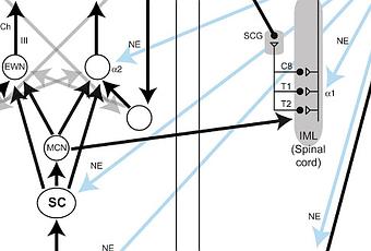 Les flèches grises indiquent les connections traversant les hémisphères au niveau du tronc cérébral. Les flèches bleues indiquent l’activité du locus coeruleus (LC) dirigée vers le tronc cérébral et le cortex. C8, T1, et T2 se réfèrent aux segments de la colonne intermediolatérale de cellules (moëlle épinière). Abréviations : ACh, acétylcholine ; CG, ganglion ciliaire ; EWN, noyau d’Edinger-Westphal (mésencéphale) ; HYP, hypothalamus ; III, nerf oculomoteur III ; IML, cellules de la colonne intermediolatérale ; MCN, noyau cunéiforme mésencéphalique ; NE, noradrénaline ; PO, noyau prétectal olivaire (mésencéphale) ; RGN, neurone ganglionnaire rétinien ; SCG, ganglion orthosympathique cervical supérieur.