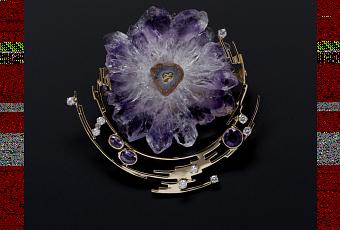 Jean Vendome, Bague 5th Avenue, or blanc et diamants, 1966 - Photo Benjamin Chelly Jean Vendome, Pendentif-Broche Rosace, or jaune,diamants, fleur-tranche d'améthyste brute, améthystes rondes et ovales - Photo Benjamin Chelly