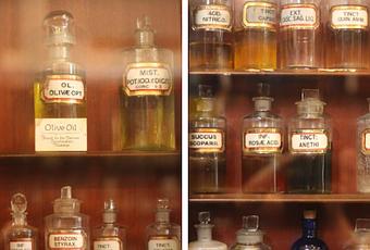 Soufflés dans des bleus profonds, bruns ambres, verts émeraude, transparents, coiffés de bouchons finement taillés, habillés - pour les plus sophistiqués - d’étiquettes en porcelaine au liseré d’or, baptisés de noms savants aux consonances latines, rangés dans des cabinets couleur palissandre… Tous ces bocaux alignés aux contenus prometteurs, énigmatiques, intrigants ont cette faculté de nous envouter/emporter sinon de nous étourdir dans un de ces voyages où les officines avaient des allures de parfumeries anciennes, où la pharmacie oscillait entre remèdes miracles, avancées scientifiques, formules expérimentales…