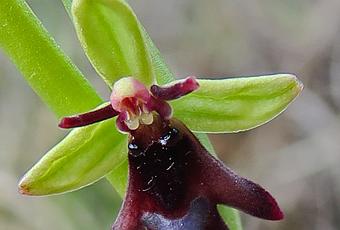 Ophrys insectifera (Ophrys mouche) : tige verte ; feuilles dressées, les inférieures en rosette, les supérieures engainantes ; bractées foliacées ; inflorescence lâche ; petites fleurs : sépales ovales, verts, étalés ; pétales filiformes, veloutés, brun-pourpre ; labelle velouté, plus long que large, trilobé, brun-pourpre, lobes latéraux divergents, lobe médian divisé en deux lobules terminaux, macule gris-bleuté de forme plus ou moins carrée ; gynostème court. Pleine lumière à ombre sur sols calcaires secs ou un peu humides : pelouses calcicoles, lisières, friches, carrières. Protégée en Meurthe et Moselle
