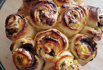 Formez un boudin en roulant le rectangle puis coupez des morceaux de 3 à 4 cm. Disposez vos ronds dans votre moule. Laissez pousser pendant 1h. Appliquez la dorure : le jaune d'oeuf avec un pinceau.