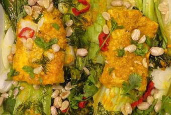 Je reviens à cette recette que j'ai préparée le 28 avril 2020, encore pendant le première phase du confinement quand j'ai eu l'audace de combiner un rdv avec l'O.R.L. avec l'achat d'un paksoi. J'avais trop envie de manger ce plat. Rukmini Iyer raconte dans ce livre qu'elle a inventé cette recette en s'inspirant du plat de poisson vietnamien renommé 'Cha ca'. Quand j'ai lu ça, j'ai pensé tout de suite à mon séjour au Vietnam.