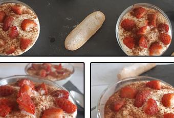 3- Déposer des quartiers de fraises. Recouvrir de crème à la ricotta. Saupoudrer de poudre chocolatée et ajouter des fraises, en déco.