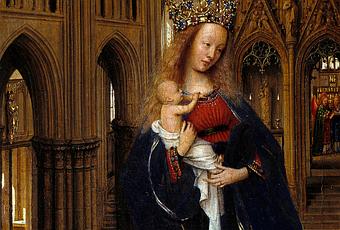 - le regard de la Vierge, modifié par rapport au tableau de Van Eyck, ne sort pas du panneau de gauche ;