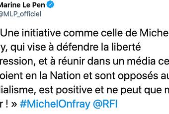 Pareille consécration venant de l’extrême droite ne peut que renforcer mon irrespect envers ce penseur dégringolant là, frappé du syndrome post-traumatique que je décrivais ici, suite aux attentats djihadistes radicaux qui lui ont fait perdre visiblement tout discernement. J’en veux d’ailleurs pour preuve le fait qu’il se soit, même brièvement, épris du gourou de l’UPR…. Quel égarement. La suite logique d’ une longue dérive identitaire qui le conduit à présent jusqu’à ce point de non retour si affligeant. Sa revue ne sera donc qu’un énième pensuum identitaire de plus dans la fachosphère. Comme s’il y en avait encore besoin… C’est d’un nouvel humanisme à réinventer dont nous avons le plus besoin, tant ce siècle nous apparait de moins en moins comme celui des lumières… Et certainement pas de ce recroquevillement intellectuel là, autour d’une pensée chevènementiste dont on ne connait que trop bien à gauche les limites, et le cul de sac qu’il constitue, comme le rappelle fort bien Miss Shelby sur twitter. je tiens d’ailleurs à la remercier pour sa vigilance, qui m’a permis de vous produire ce baiser de Judas là. Ce tweet de Le Pen, un collector, assurément, que l’on pourra opportunément ressortir à l’occasion, chaque fois qu’un(e) perdu(e) nous brandira la pensée lumineuse (sic) de cet autrefois philosophe là.