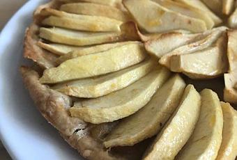 Cette tarte est composée d’une pâte à tarte, d’une compote et de tranches de pommes sur le dessus. Vous pouvez acheter votre pâte à tarte et votre compote, mais si vous avez le temps de les faire vous-même, la recette sera encore meilleure !